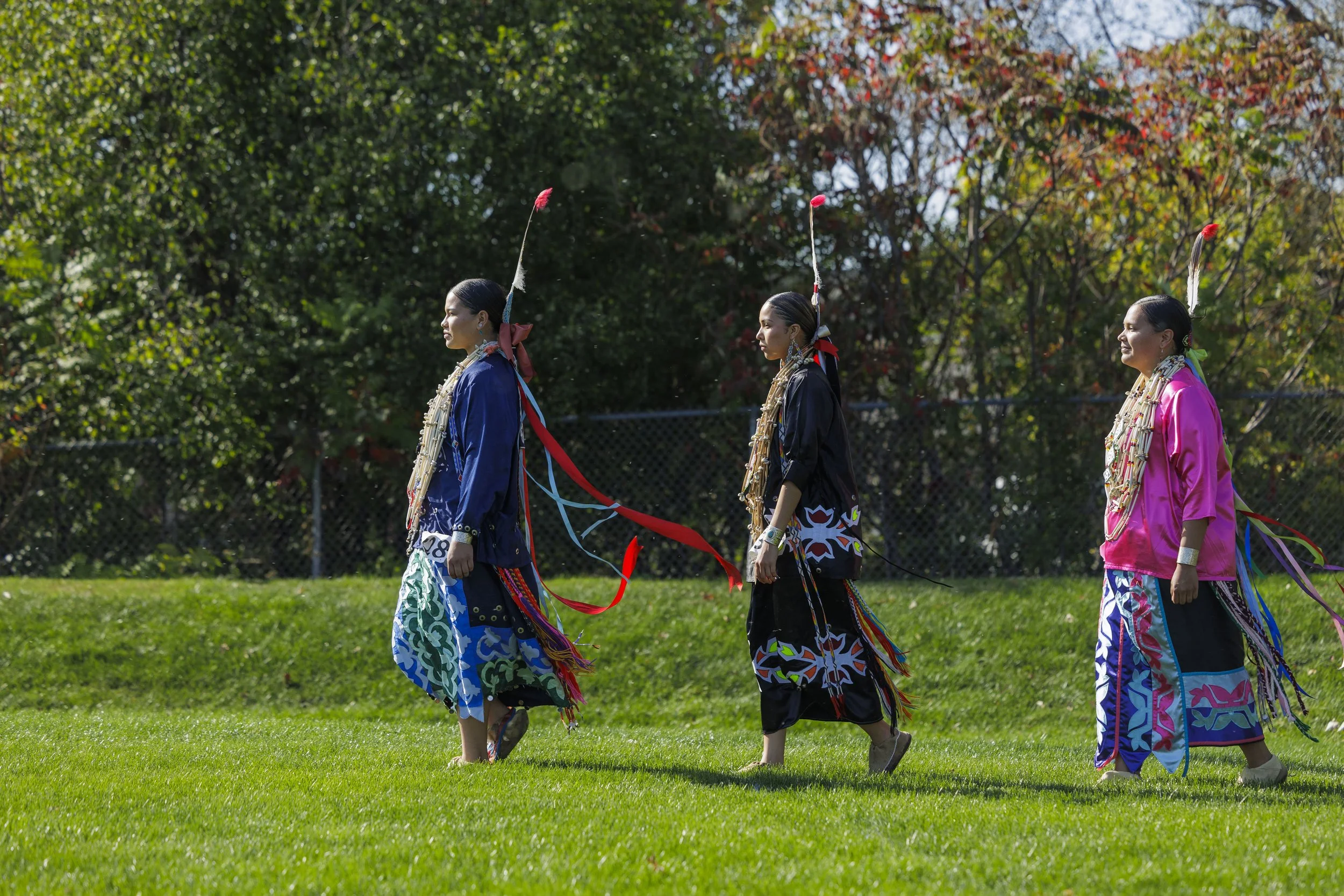 3 applique dancers with red tip feathers, in a field, walking in the wind